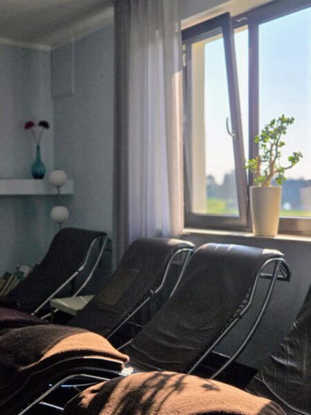 Ihr findet hier eine 60°C und 90°C Sauna, ein Dampfbad und eine Sole-Vernebelungskabine. Was für eine tolle Auswahl! Außerdem gibt es auch die Möglichkeit, sich Fußbäder einzulassen und die wohltuende Wärme vor Infrarotsitzen zu genießen. Wer die Wahl hat … Ich habe mich auf jeden Fall erstmal durch die vielfältigen Angebote durchprobiert und war sehr angetan!
