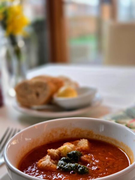 Als Start gab es eine Tomatensuppe mit hausgemachten Croutons und Brot. Ich bin ehrlich, ich bin eigentlich kein großer Fan von Tomatensuppen, aber diese hier hat mir wirklich gut geschmeckt, vor allem mit dem Topping aus Pesto und Croutons!
