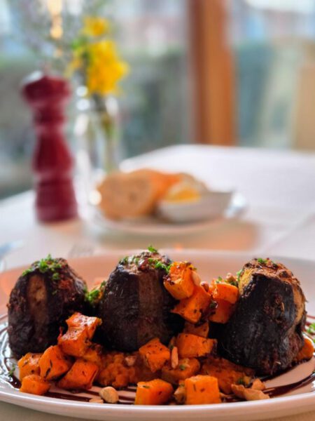 Bei der Hauptspeise durfte ich zwischen einem vegetarischen Gericht, einem Fisch- oder einem Fleischgericht wählen. Natürlich entschied ich mich für das vegetarische Gericht: Aubergine aus dem Ofen an Tomate Süßkartoffelragout mit pikantem roten Linsengemüse und gerösteten Cashnewkernen. Liest sich super? Hat auch genau so mega geschmeckt. Die Aubergine war genau richtig durch und perfekt gewürzt. Ein Hauptspeise, die mich sehr begeistert hat!