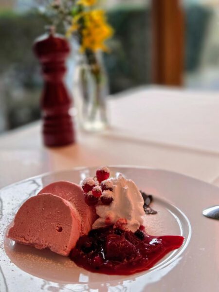 Wer mir schon länger folgt weiß, dass ich ein Faible für Desserts und Süßspeisen habe. Und diese war genau der richtige Abschluss. Es gab Himbeer-Parfait mit Beerenkompott. Nicht zu schwer nach den zwei Gängen und genau richtig für die Jahreszeit. Absolut lecker!
